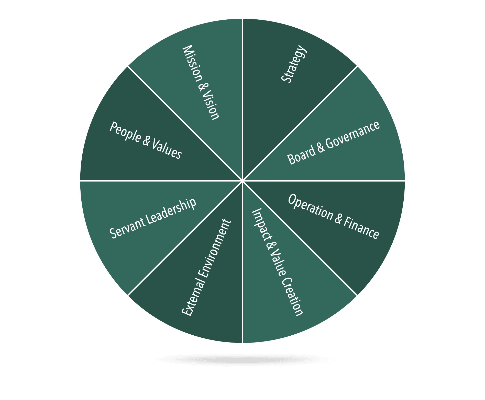 I work with organizational health from a whole-system perspective. The framework brings together strategy, people & values, mission & vision, servant leadership, governance, operations, impact, and the external environment. With the inherent value of people at the center, I combine structure, transparency, strong relationships, and systemic thinking to support healthy, sustainable organizations built on hope, wholeness, and long-term impact.