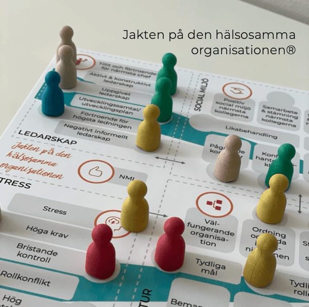 Jakten på den hälsosamma organisationen® (The Quest for the Healthy Organization): This interactive exercise helps teams visualize and understand the inner dynamics of the workplace. Using a game board, color-coded pieces, and reflection cards, participants explore key areas such as leadership, stress, engagement, health, workplace culture, and organizational change. Through guided dialogue and systems thinking, the game creates insight into patterns, causes, and connections - and supports concrete actions that strengthen collaboration, leadership, and a healthy, productive work environment.