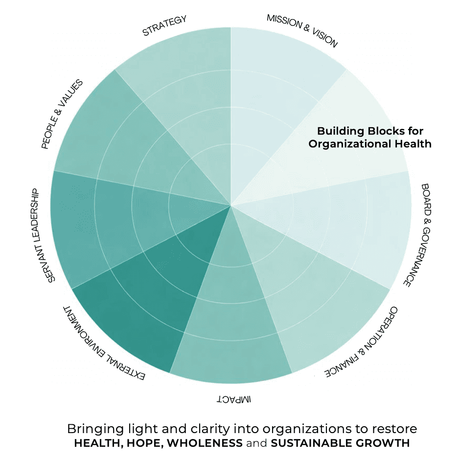 I work with organizational health from a whole-system perspective. The framework brings together strategy, people & values, mission & vision, servant leadership, governance, operations, impact, and the external environment. With the inherent value of people at the center, I combine structure, transparency, strong relationships, and systemic thinking to support healthy, sustainable organizations built on hope, wholeness, and long-term impact.